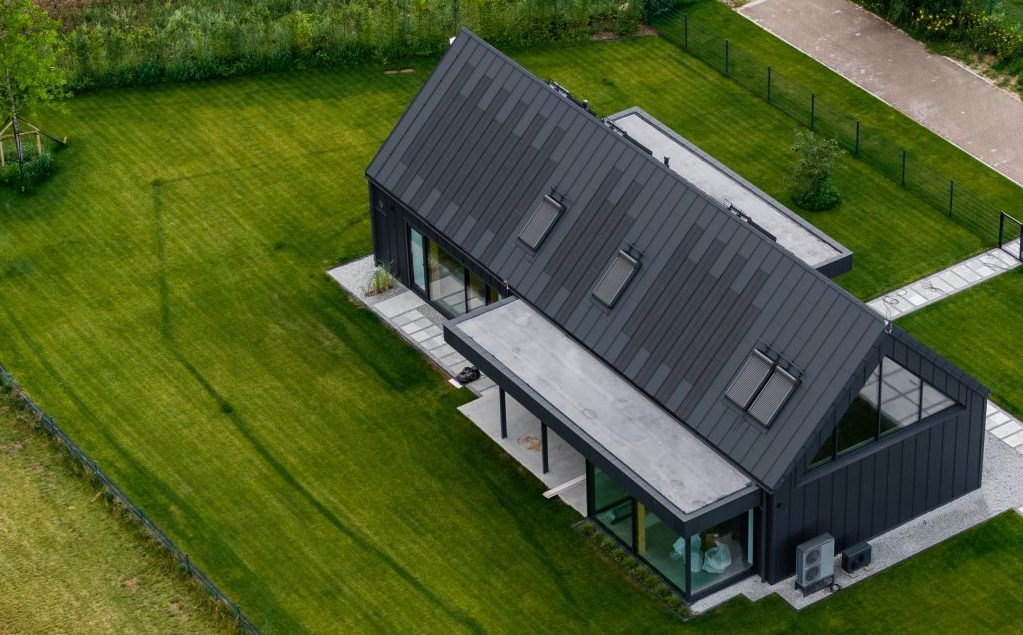 Estetyka została połączona z innowacyjną technologią i lekkością zintegrowanych paneli fotowoltaicznych SOLROOF. Stosując nowoczesne rozwiązanie wykluczyliśmy nieatrakcyjne, ciężkie panele fotowoltaiczne, wraz z widoczną konstrukcją montażową i okablowaniem, które znamy ze standardowych rozwiązań.