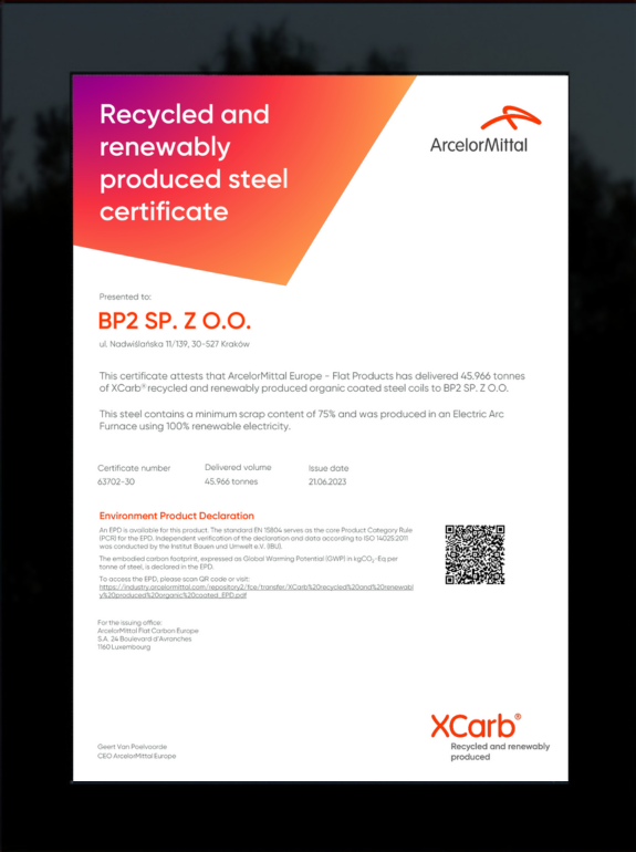 Do produkcji dachu SOLROOF wykorzystujemy niskoemisyjną stal XCarb® od ArcelorMittal. Stal XCarb® jest produkowana z materiałów pochodzących z recyklingu, korzystając wyłącznie z odnawialnej energii elektrycznej. Zastosowanie materiałów o niskim wpływie na środowisko pozwala na obniżenie śladu węglowego o 62%.